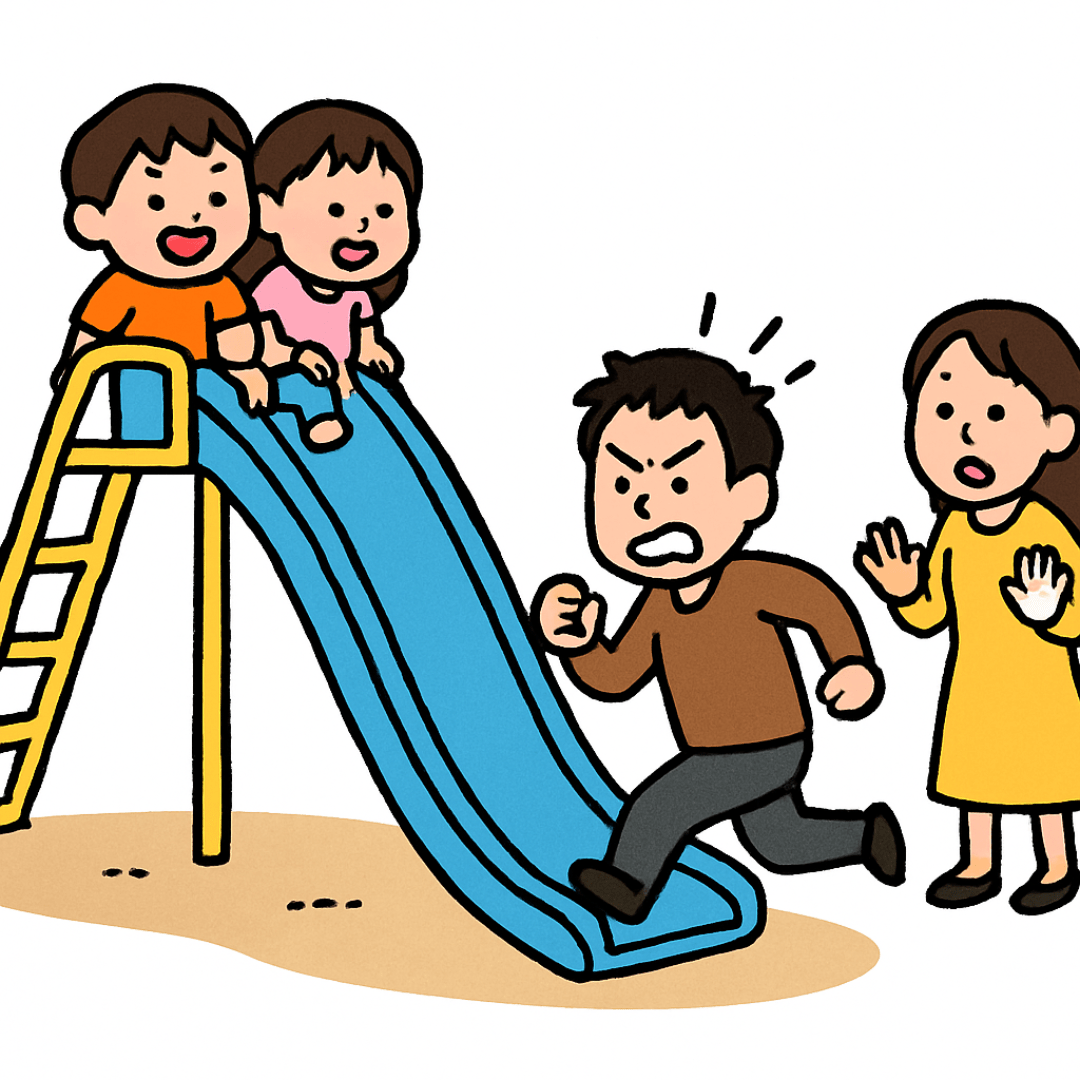 また同じ事してて、同級生の父が滑り台駆け上がり、うちの子頭ひっぱたき腕掴み、ビックリして泣いてるうちの子怒鳴り散らし