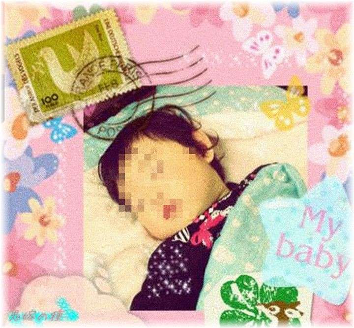 生まれたばかりの赤ん坊とドヤ顔のA子の周りを花やら蝶々やらのスタンプやフレームで