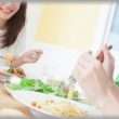 食事中も汚さないようにハンカチ2枚にひざ掛けをかけて