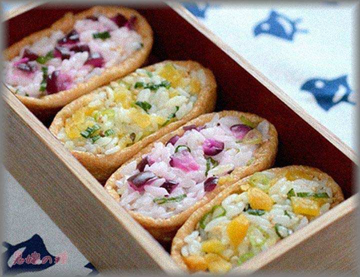 うちのお稲荷さんは私実家の作り方で甘い味付けで中身は五目、口を上にして沢庵や野沢菜を盛る感じ