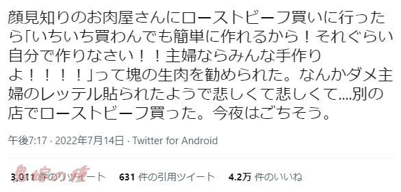 【雑談】ツイッター「肉屋でローストビーフ買おうとしたら云々…」スレ民「これ嘘松っぽいよねぇ」「誇張がやばそう」